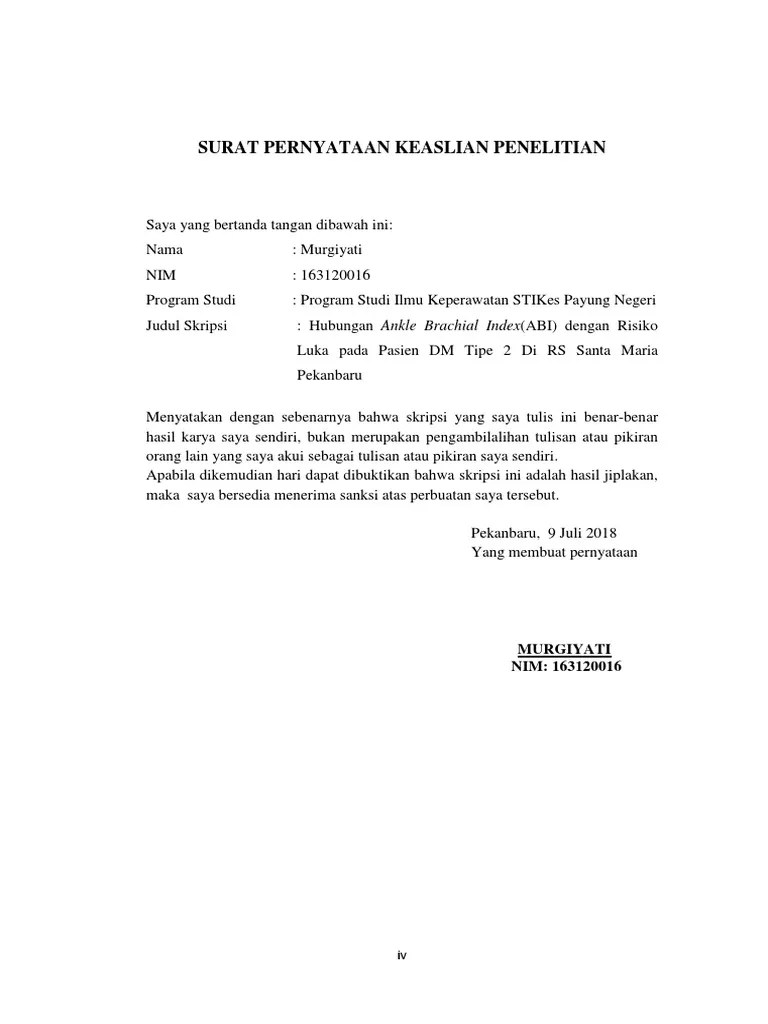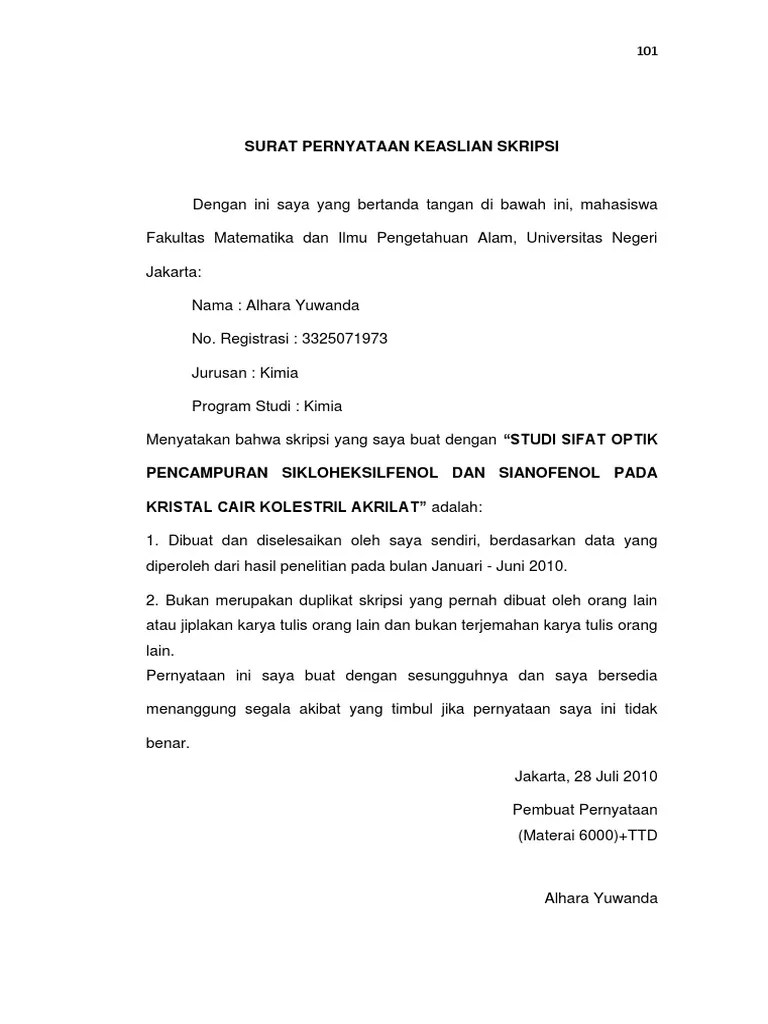 Contoh Surat Pernyataan Orisinalitas Skripsi - 2 - Isi form yang disediakan pada aplikasi pdf.. Berikut ini contoh surat pernyataan kerja yang . Contoh surat pernyataan keaslian tugas akhir. Hari pada naskah saya tersebut diketemukan unsur yang tidak sesuai dengan surat pernyataan. Surat pernyataan keaslian tulisan yang bertanda tangan di bawah ini: Saya yang bertanda tangan di bawah ini: